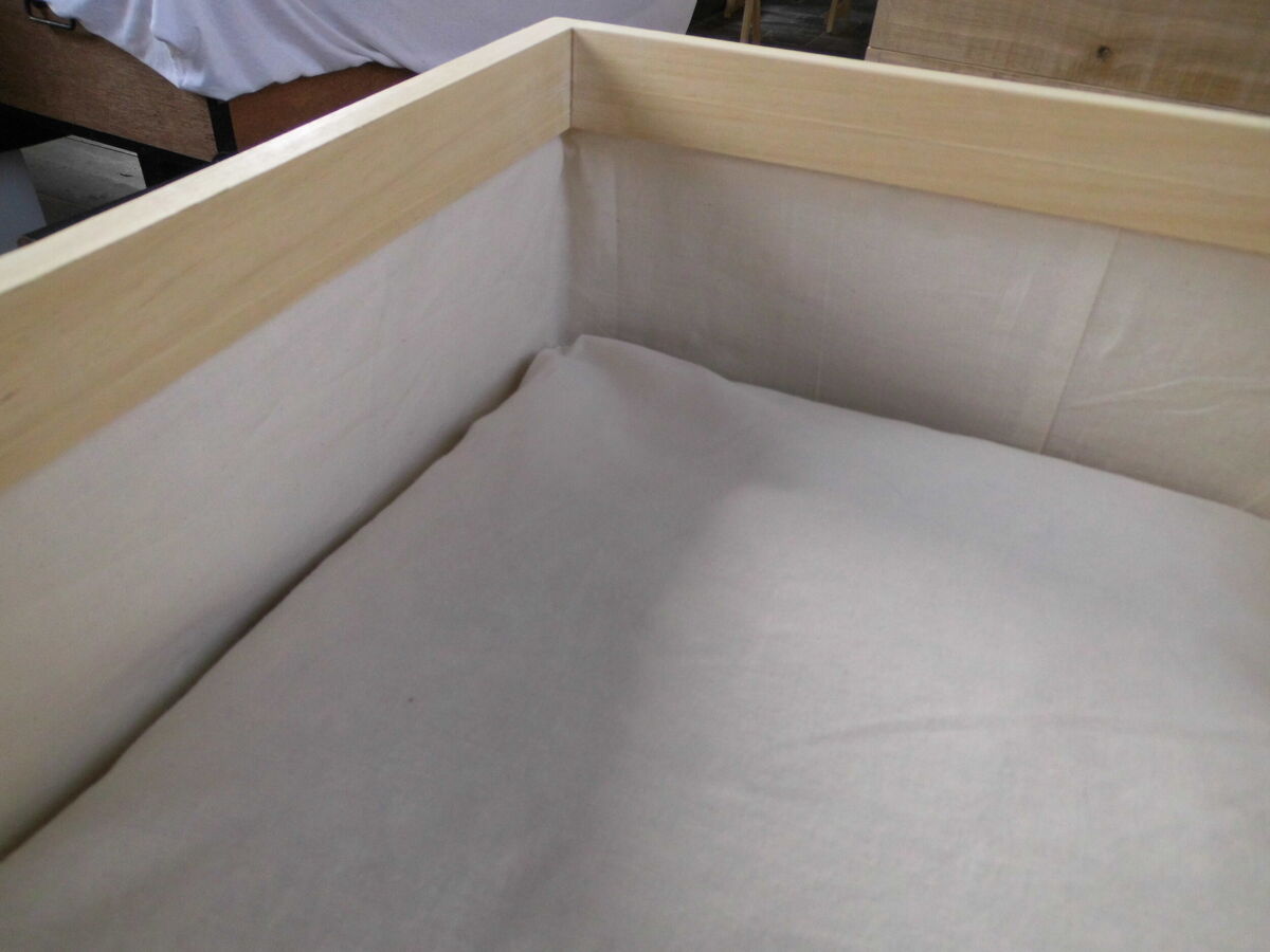 - Matrasje en kussen van ongebleekt katoen, kussen gevuld met houtspaanders.