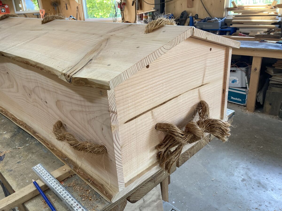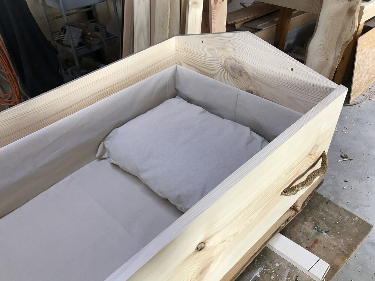 Natuurkisten van de Kistemakker zijn speciaal ontworpen voor natuurbegraafplaatsen, en worden stuk voor stuk met de hand gemaakt. Hiervoor gebruiken we verantwoord gekapt inlands hout van de Douglas spar. Houtverbindingen zijn zo veel mogelijk d.m.v. deuvels en milieuvriendelijke lijm. De hengsels zijn gemaakt van Manilla natuurvezeltouw. De binnenkant kan worden afgewerkt met ongebleekt katoen of jute. Het matrasje en het kussen zijn gevuld met houtspaanders, zijkanten kunnen al of niet bekleed worden. Ook andere vullingen zijn mogelijk, bv riet, wol of stro.
