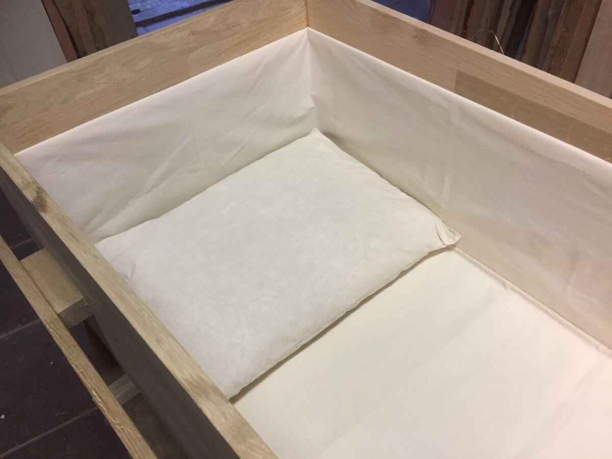 - Matrasje en kussen van ongebleekt katoen, kussen gevuld met houtspaanders.