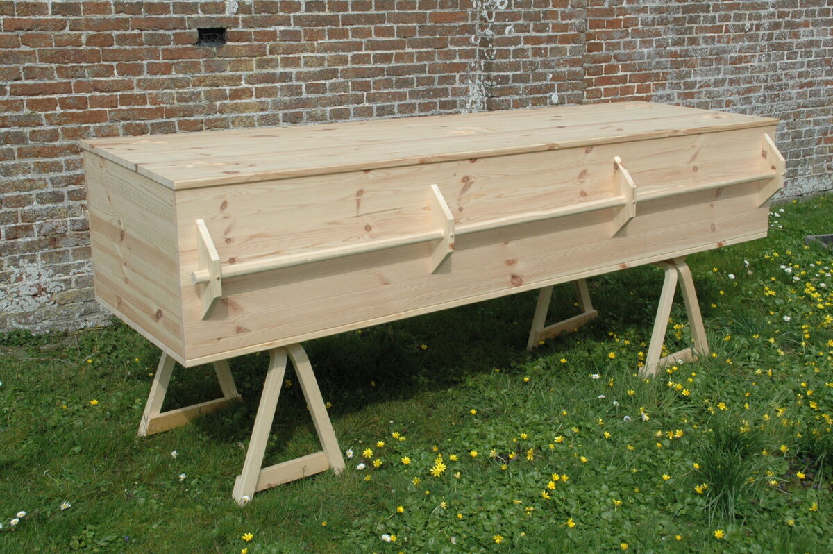Uitvaartkist gemaakt van uit massief verlijmde grenen panelen.