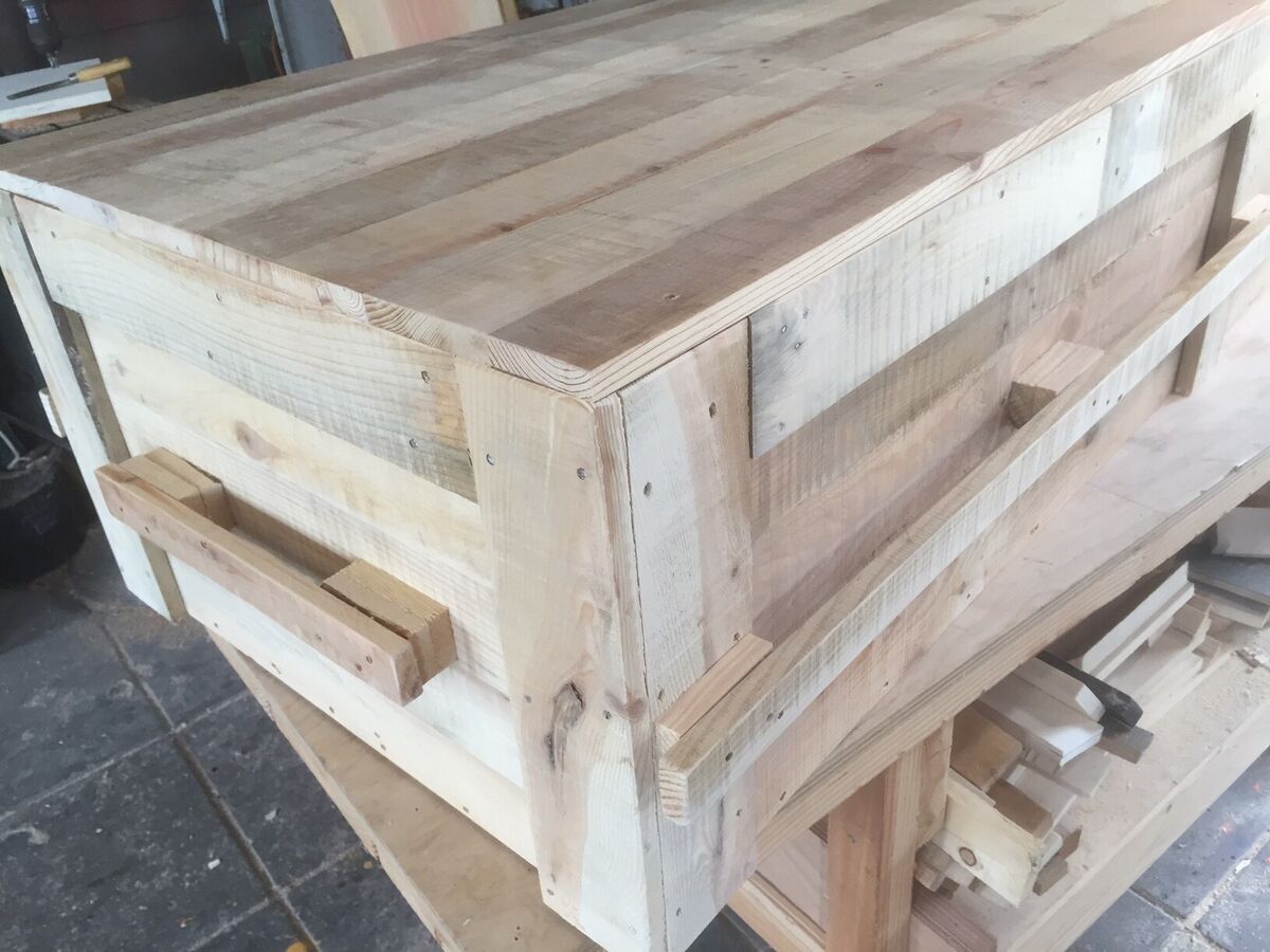 Stijlvolle eigentijdse uitvaartkist gemaakt van gebruikt en gedroogd pallethout.